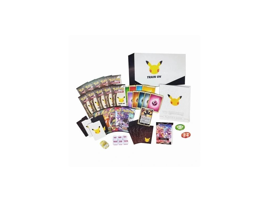 Pokémon Celebrations Elite Trainer Box ETB je speciální dárkové balení pro všechny hráče, kteří se chtějí v hraní posunout o další úroveň a začít pravidelně chodit na turnajová hraní. Uvnitř balení naleznete speciální promo kartu s Pokémonem Greninja Gold Star, která zatím nikde jinde nevyšla. Obsah balení dále doplňuje 10 doplňkových Boosterů speciální edice Celebrations, 5 klasických Boosterů, 65 herních obalů s motivem Pikachu tváře, 45 karet energií, průvodce edicí Celebrations, 6 kostek pro značení zranění, házecí kostka, 2 akrylové žetony pro popálení a otravu, 4 pořadníky, anglická pravidla a kód do online hry.